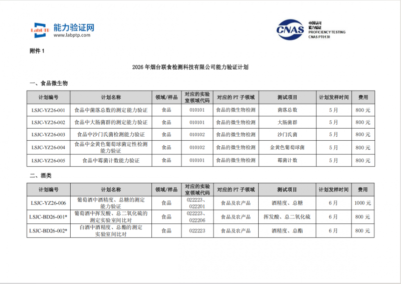 为满足各检验检测实验室对能力验证活动的需求,现发布烟台联食检测科技有限公司2026年能力验证计划共14轮次,涵盖食品农产品、粮油、乳制品、酒品等行业,涉及微生物、营养成分、药物残留、毒素等子领域,详情见附件1。同时我公司也可根据监管部门或实验室实际需求提供定制化服务,具体可拨打联系人电话进行咨询沟通。现将能力验证事宜预告如下: