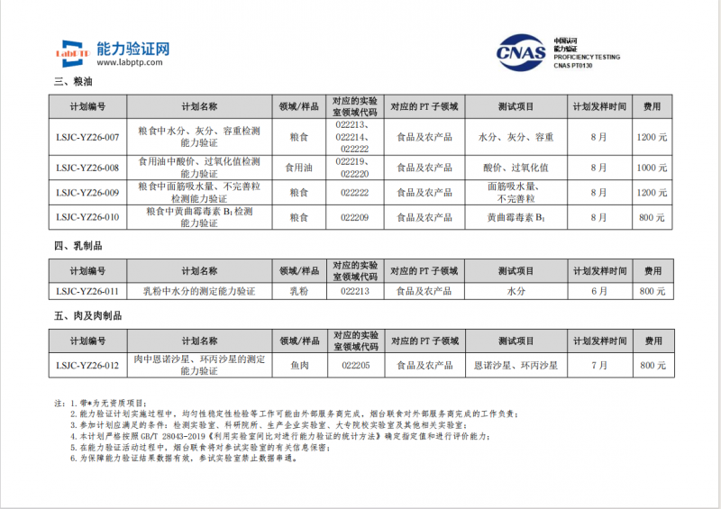 欢迎参加烟台联食检测科技有限公司2026年能力验证计划。烟台联食检测科技有限公司,作为中国合格评定国家认可委员会认可的能力验证提供者(CNAS PT0130),具有丰富的能力验证实践经验。